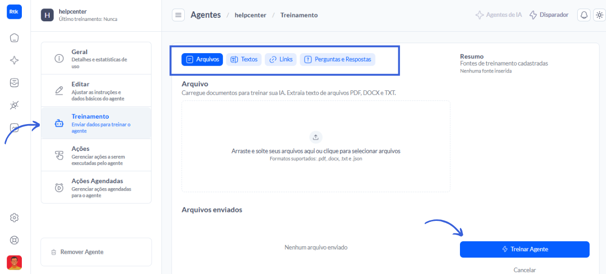 Selecione as fontes de conhecimento que ele usará no atendimento: