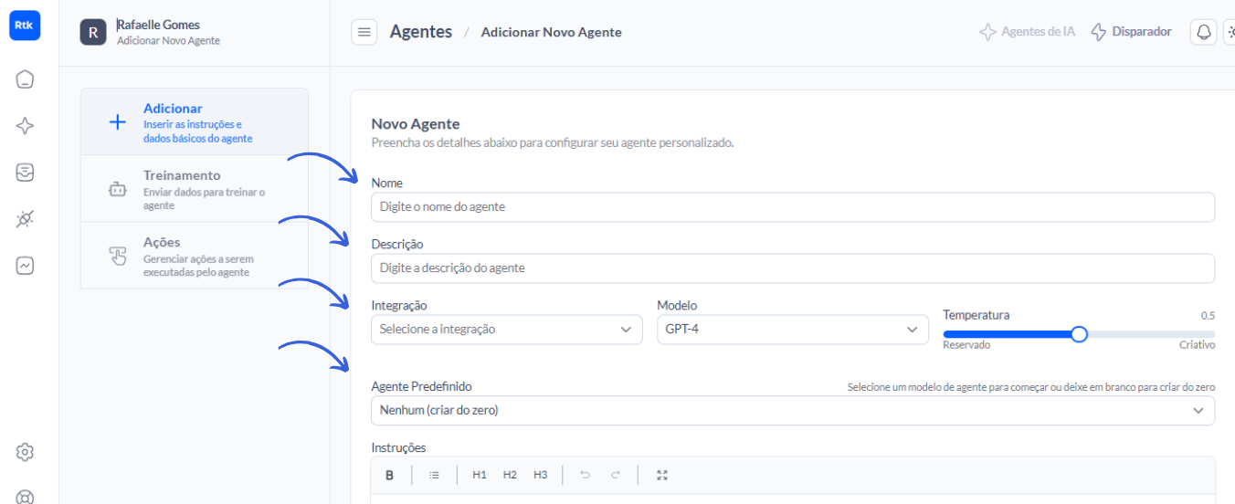 Confira o passo a passo completo para criar seu Agent dentro do painel da Rotik.
