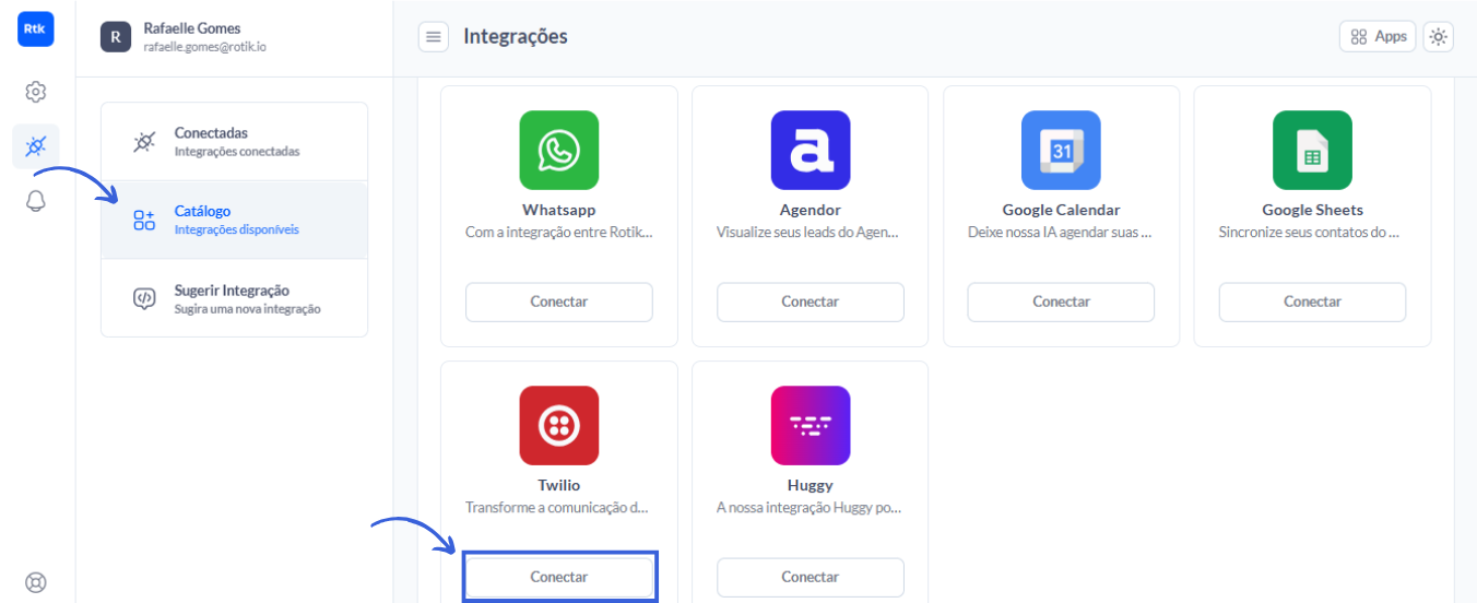 3. Selecione a integração Twilio: Clique em “Conectar"