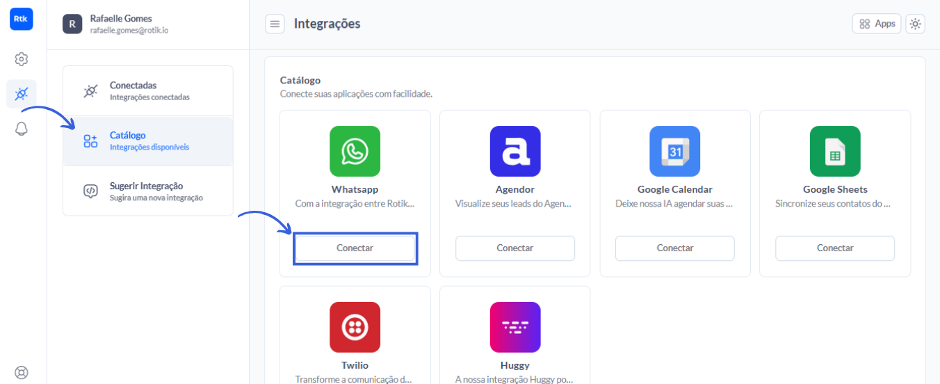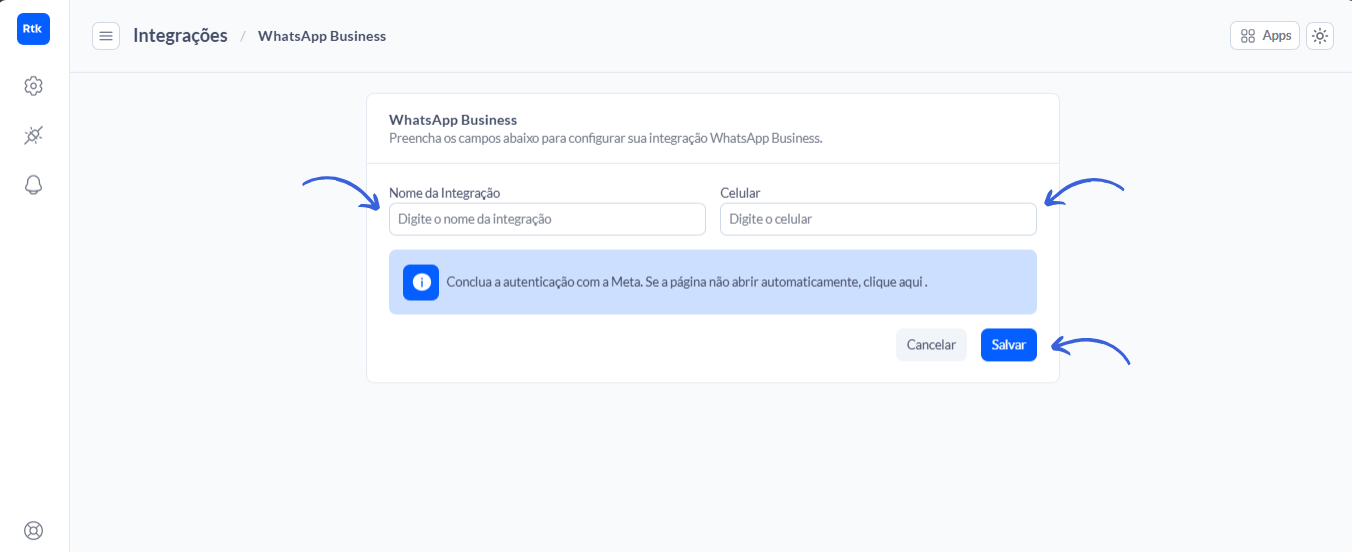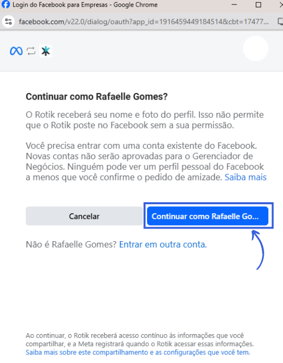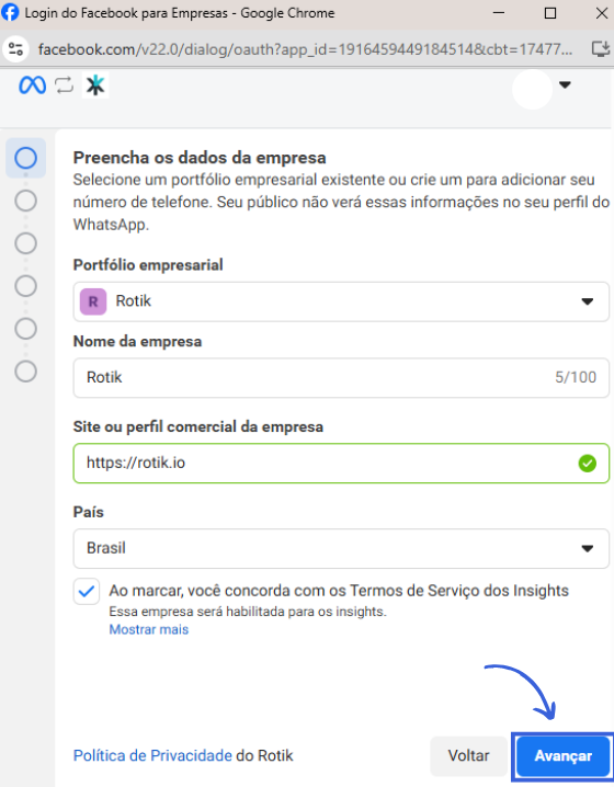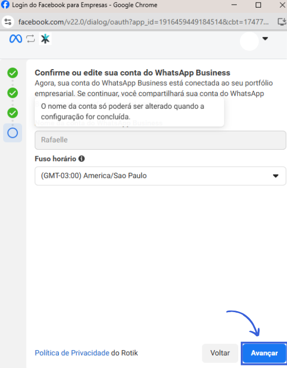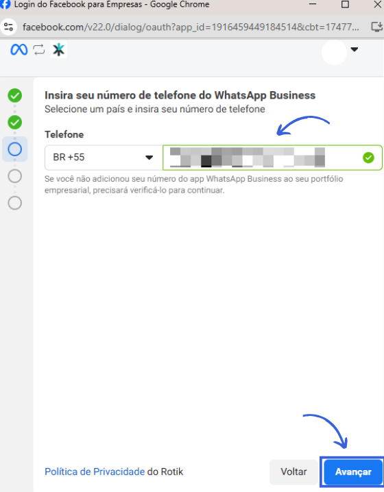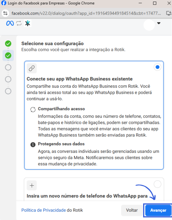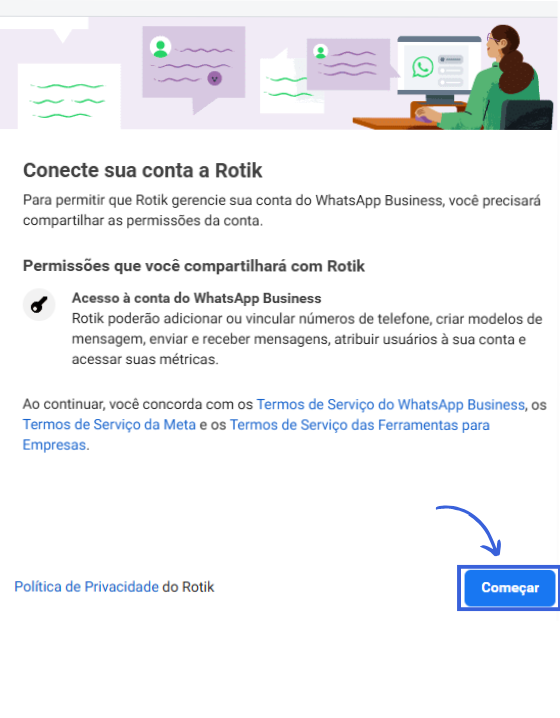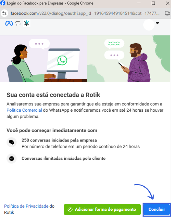 Uma nova janela será aberta para conectar seu WhatsApp Business à Rotik.